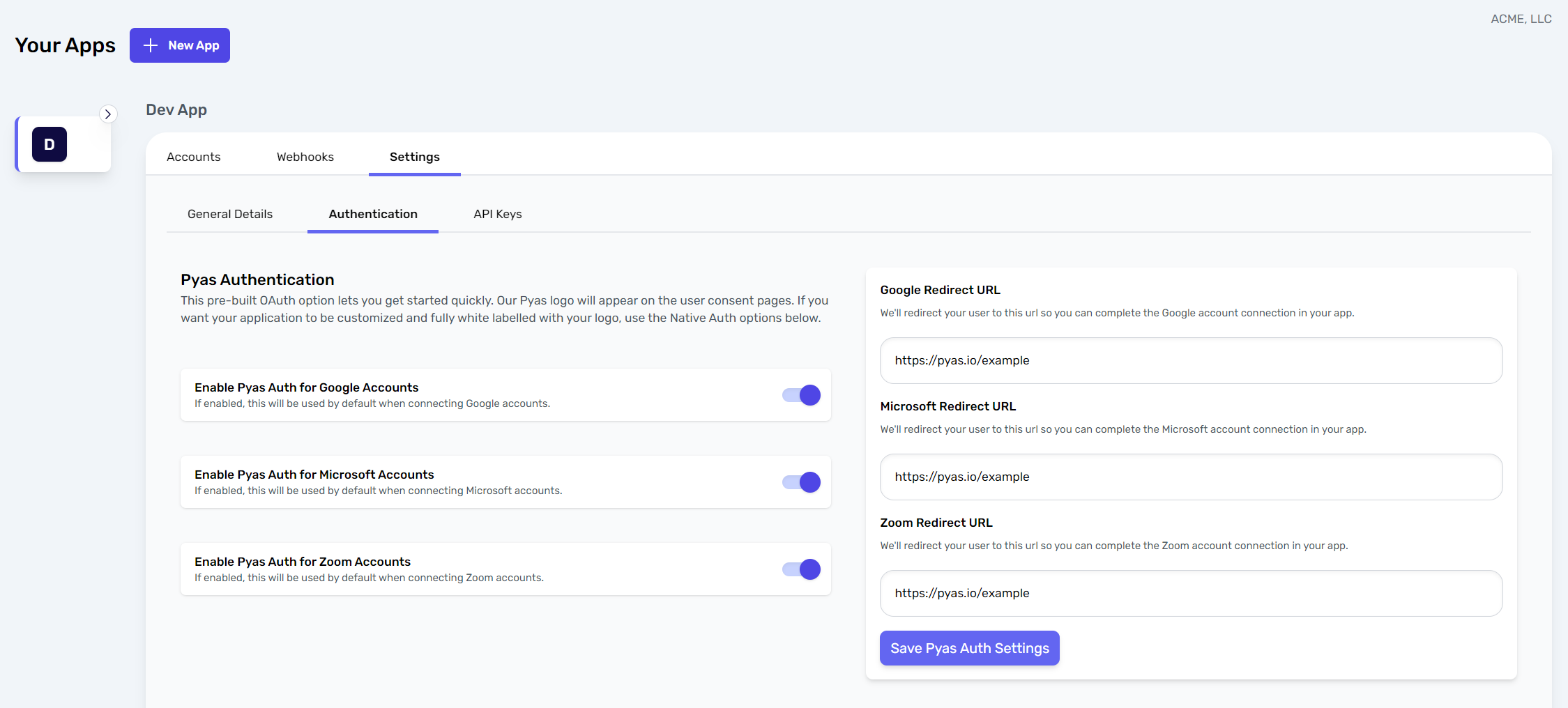 4. After you add the redirect URLs, click the **Save Pyas Auth Settings** button.